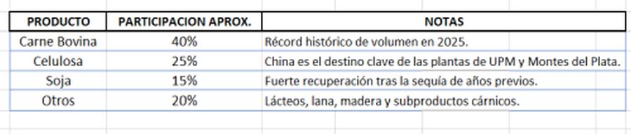 Exportaciones a China: Alcanzaron los US$ 3.493 millones, representando el 26% del total de las ventas externas de Uruguay y Tras algunos años de déficit, Uruguay cerró 2025 con un balance favorable impulsado por la recuperación de los precios de la carne y la soja.
