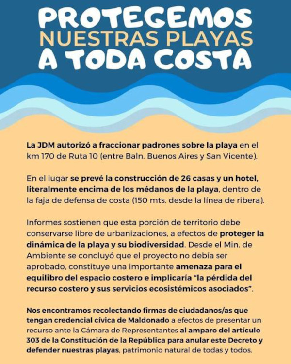 MALDONADO (Uypress)- La bancada del Frente Amplio en Maldonado y vecinos de la zona del Balneario Buenos Aires y alrededores, juntan firmas para derogar el decreto N.º 4056 que habilita la construcción de Marina Beach, un complejo hotelero y residencial sobre las dunas de la costa esteña.