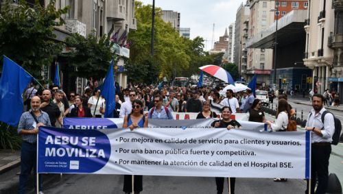 MONTEVIDEO (Uypress) - Con una multitudinaria movilización en la calle, los y las trabajadoras de la Banca Oficial buscan avanzar en la negociación de su convenio colectivo.