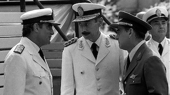 Emilio Eduardo Massera, Jorge Rafael Videla y Orlando Ramón Agosti, los tres jefes militares que planearon y ejecutaron el golpe de Estado de 1976