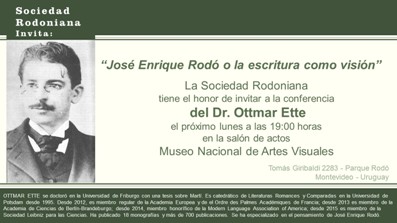 El lunes a las 19 horas en el Museo Nacional de Artes Visuales el Dr. Ottmar Ette, catedrático de literatura de la Universidad de Potsdam, brindará la Conferencia "José Enrique Rodó o la escritura como visión".
