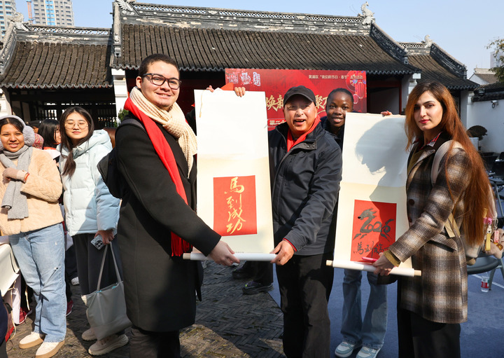 El 12 de febrero se inauguró en el Templo de la Cultura de Shanghai la XXI edición de la Feria de Couplets de Laoximen. El estudiante brasileño de intercambio Eduardo (izquierda) muestra la obra de caligrafía con temática del Año del Caballo que le han regalado. (Xinhua/Wen Zhe)