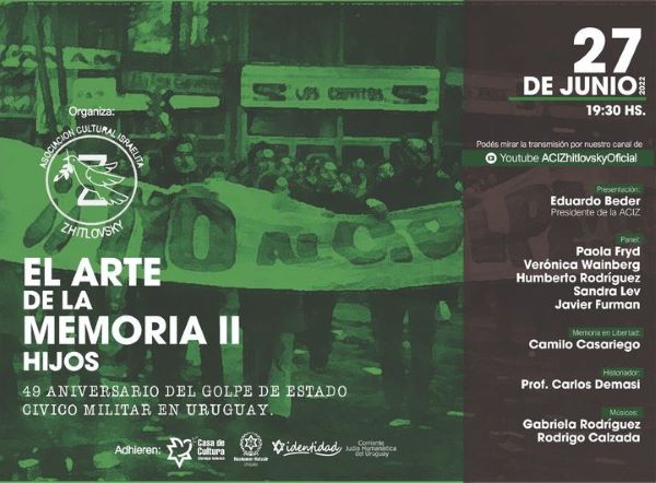 MONTEVIDEO (Uypress) - Este lunes 27, con motivo de conmemorarse este año un nuevo aniversario del golpe de Estado en Uruguay, la Asociación Cultural Israelita Dr. J. Zhitlovsky le invita a participar de la segunda edición de la actividad "El Arte de la Memoria", espacio para reflexionar, homenajear, pero sobre todo para mantener viva la memoria del pueblo uruguayo con respecto a los hechos acaecidos durante la dictadura cívico militar uruguaya.