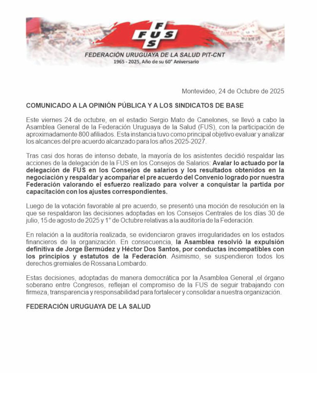 CANELONES (Uypress)- La Asamblea General de la Federación Uruguaya de la Salud, reunida en el polideportivo Sergio Mato de Canelones, convocada para evaluar y aprobar el preacuerdo alcanzado en los Consejos de Salarios, y que alcanzó los 800 participantes, resolvió por mayoría amplia las expulsiones del histórico dirigente Jorge Bermúdez junto al ex secretario de Finanzas, Héctor Dos Santos, alegando conductas “incompatibles con los principios y estatutos” del sindicato.