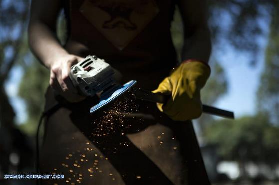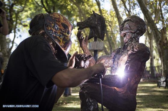 El artista argentino, Jorge Buldrini, trabaja sobre una escultura durante el "Segundo Encuentro Internacional de Herreros" (Xinhua/Martín Zabala)