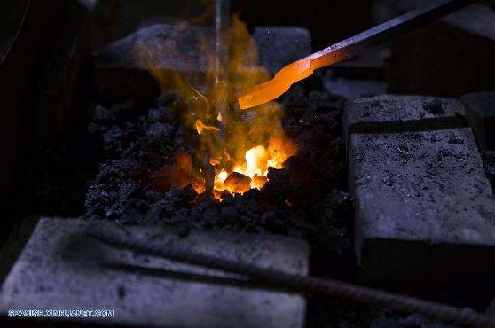 Aprendices de herreros trabajan con piezas de metal en el fuego (Xinhua/Martín Zabala)