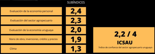 En una escala del 0 al 4, el Indice de Confianza del Sector Agropecuario Uruguayo se encuentra en un 2.2, apenas por encima del punto medio de la escala.