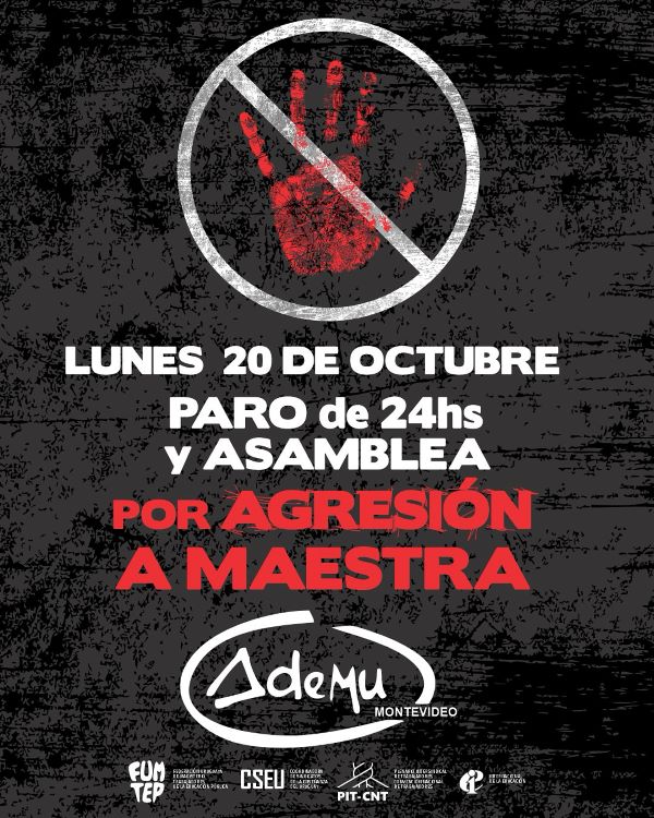 La Asociación de Maestros de Uruguay (Ademu) resolvió la realización de un paro de 24 horas en las escuelas de Montevideo el próximo lunes 20 de octubre, en respuesta a la agresión sufrida por una docente de parte de una madre.