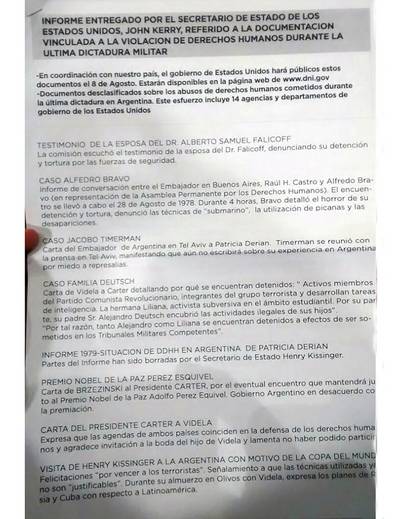 Según informa Clarín, los funcionarios coincidieron en señalar que la documentación desclasificada alcanza a casos de secuestros y torturas emblemáticos como el de Alberto Samuel Falicoff; Alfredo Bravo; Jacobo Timerman, la familia de Alejandro Deutsch, el informe escrito por Patricia Derian sobre la situación de los Derechos Humanos en el país, informes de inteligencia sobre la forma en que se produjo el golpe de Estado de 1976, "negociaciones" entre Estados Unidos y los militares por cuestiones "geopolíticas" y cartas presentadas por el entonces presidente estadounidense, Jimmy Carter a Jorge Videla.