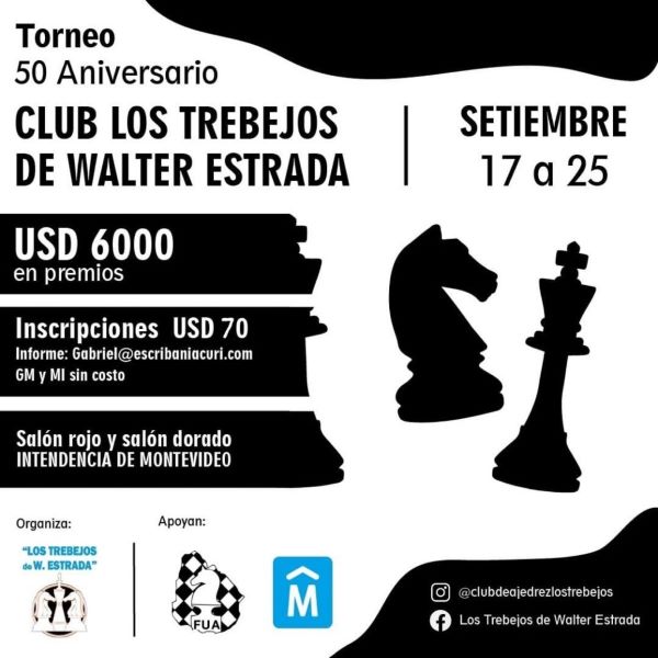 MONTEVIDEO (Uypress) – Del 17 al 24 de setiembre se llevará a cabo en la IMM el torneo para celebrar el 50 aniversario del Club de Ajedrez “Los Trebejos de Walter Estrada”.